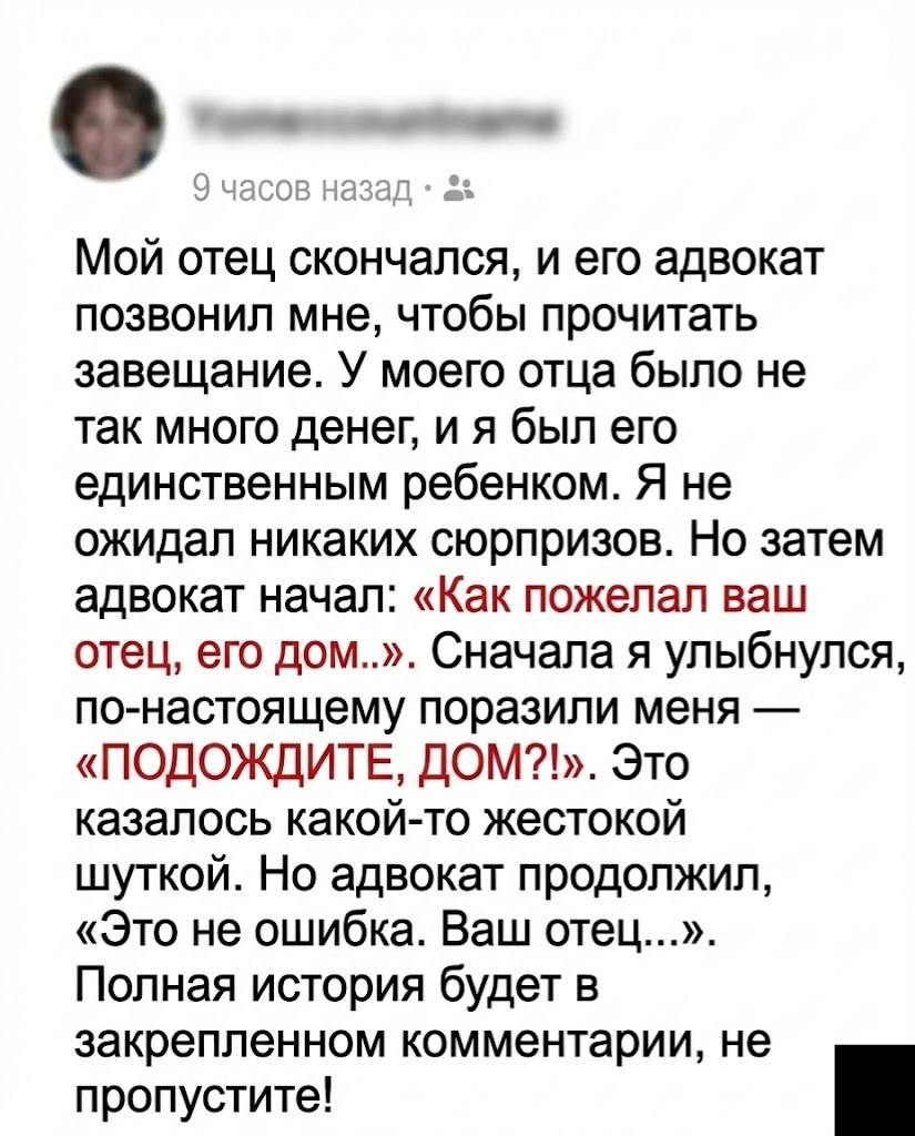 У моего отца не было много денег, а я была его единственным ребенком. Я не ждала никаких сюрпризов. Но затем адвокат начал: «Согласно воле вашего отца, его дом…»