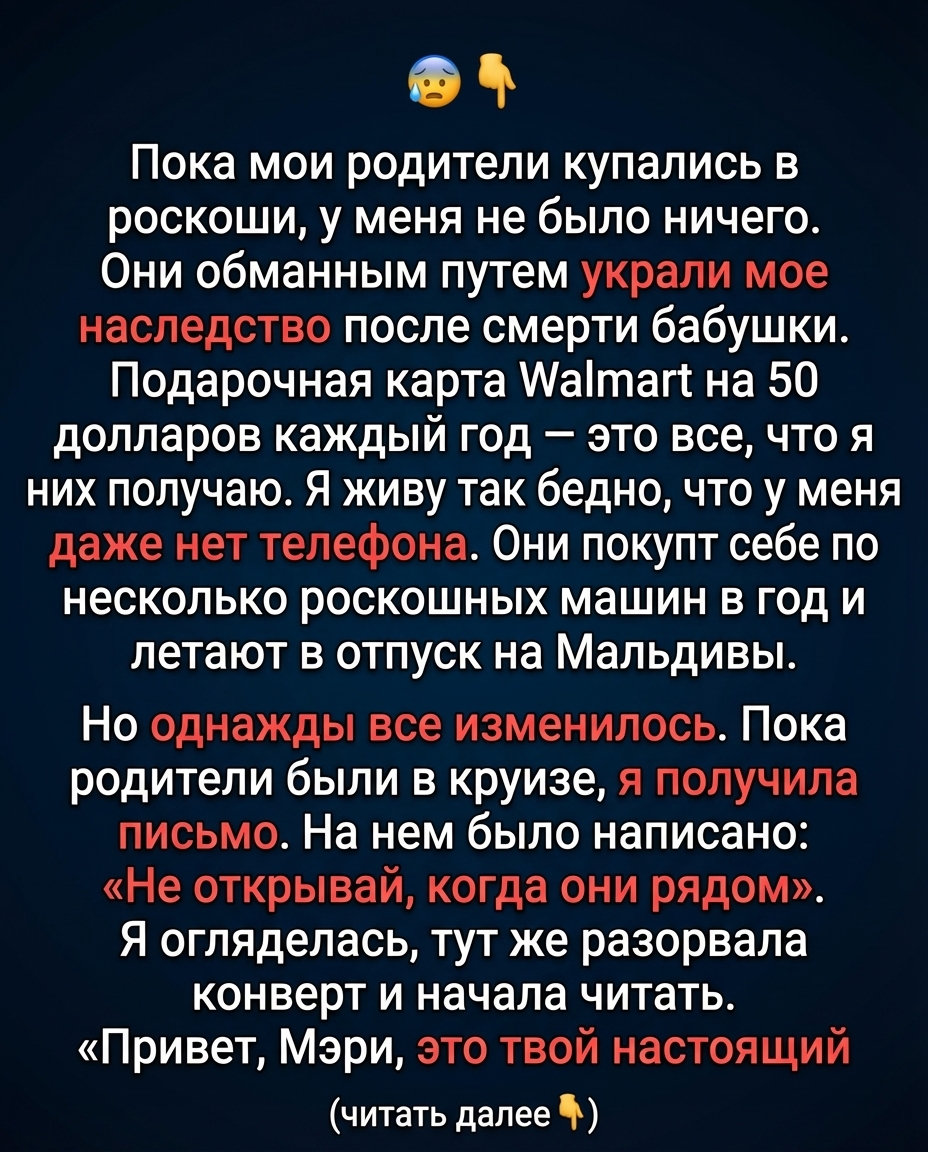 «Мэри, это твой настоящий отец. Я годами пытался найти тебя. Твоя бабушка оставила тебе большое наследство, и я боролся, чтобы вернуть его тебе. Встреться со мной по указанному внутри адресу. Пришло время вернуть то, что принадлежит тебе, и, наконец, изменить свою жизнь».