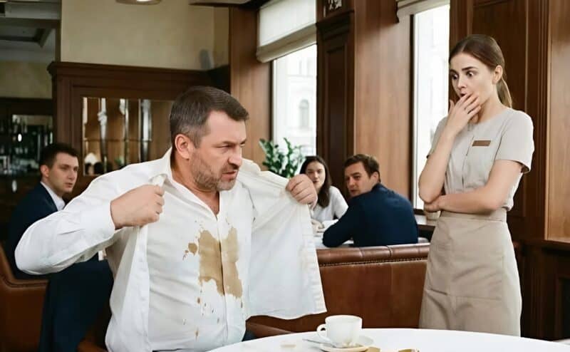 Анна несла поднос с кофе к столику, где сидел владелец кафе. Проход был узким, так что когда она хотела поставить чашку на стол, владелец резко развернулся, не посмотрев по сторонам, и его локоть ударил по подносу. Стакан перевернулся, горячее кофе хлынуло прямо на его белую рубашку.
