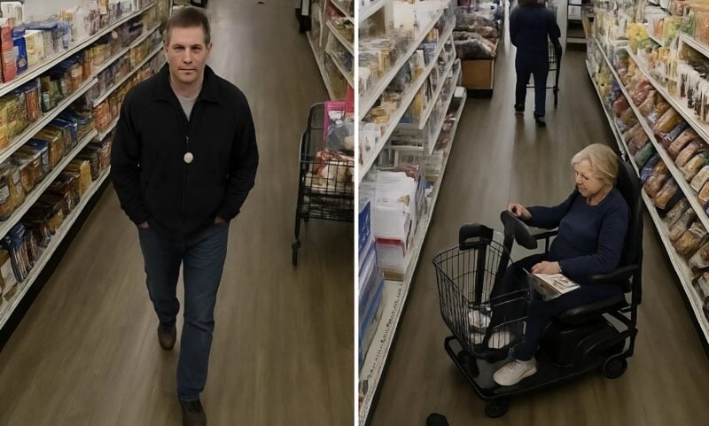В кадре, среди обычных покупателей, неизменно появлялась женщина в инвалидной коляске, которая медленно каталась между полками, улыбалась персоналу и принимала сочувственные взгляды от людей; она просила помочь взять с верхней полки, благодарила, иногда шутливо беседовала с кассиршей, и никто, никто не обращал внимания на её коляску как на место для тайного хранилища.