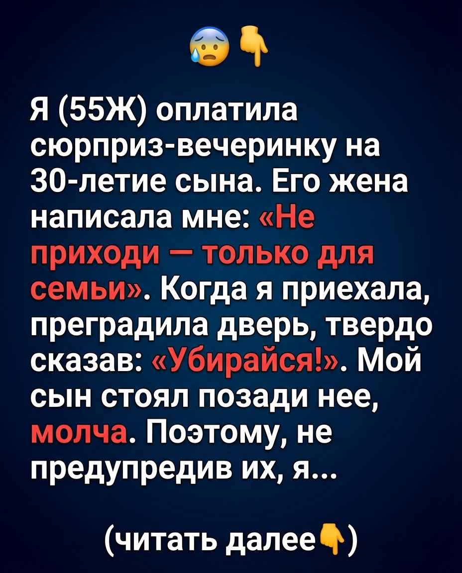 Я (55 лет, женщина) оплатила вечеринку-сюрприз в честь 30-летия моего сына. Его жена написала мне: «Не приходи – только семья». Когда я приехала, она загородила дверь, твердо сказав: «Убирайся!» Мой сын стоял за ней, молча.