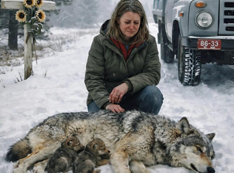 Женщина остановила машину и вышла. Подойдя ближе, она с ужасом осознала, что перед ней лежит волчица. Животное было замёрзшим, обессиленным, а рядом с ним жались два маленьких волчонка. Малыши скулили, дрожали от холода и страха, словно умоляя мать встать.