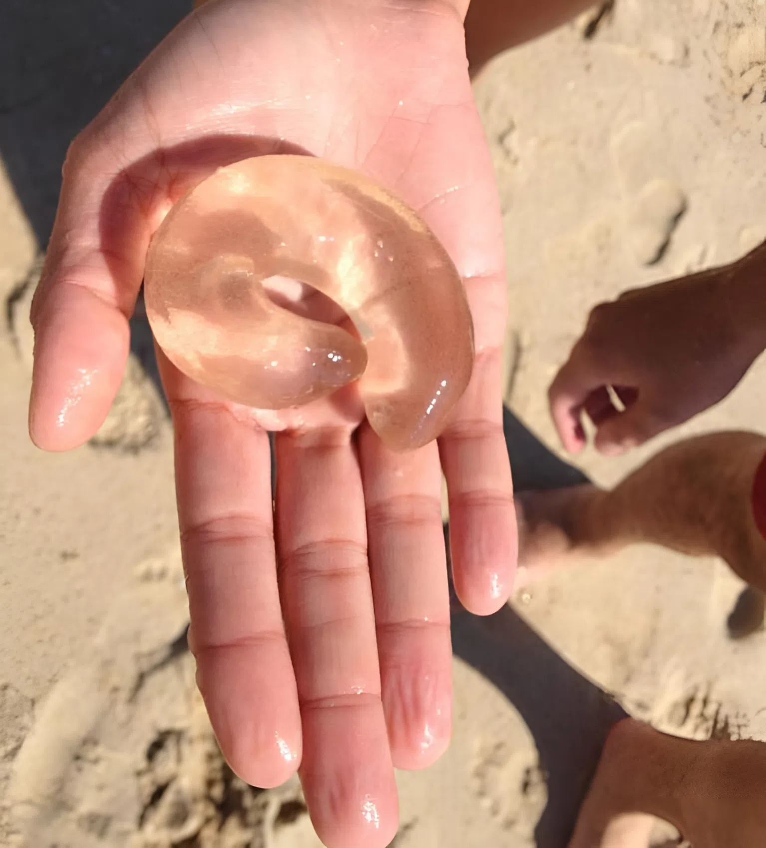 Мы гуляли по пляжу ранним утром, когда песок ещё холодный. Никаких ожиданий, просто обычная прогулка: ракушки, пара медуз, обломки водорослей. Но вдруг мой взгляд зацепился за что-то странное — прозрачный полумесяц, будто кусочек желе, лежащий прямо у кромки воды.