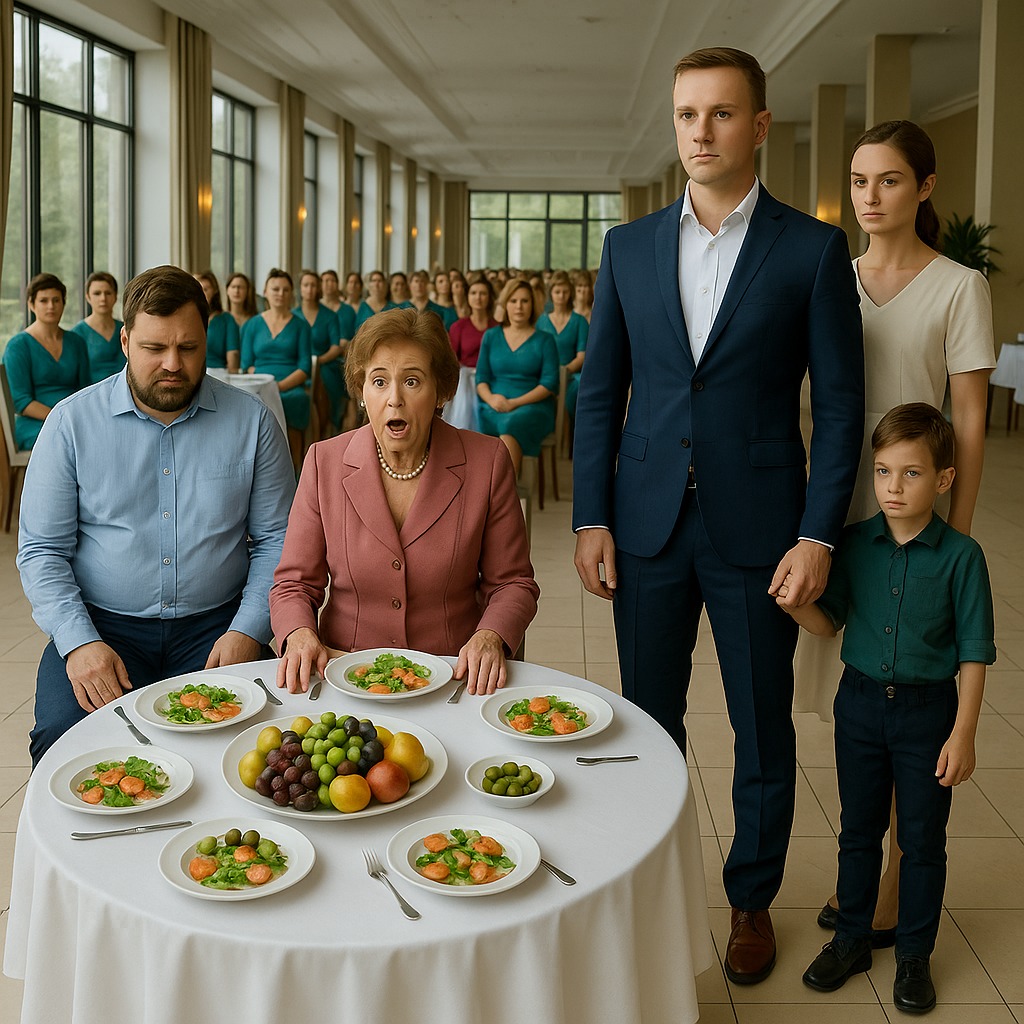 Валентина Сергеевна опустилась на стул. Зал молчал — тяжело, неловко. Официант нерешительно подошёл с подносом, но она отмахнулась.