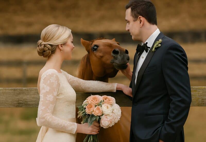 Мой жених не возражал против этой идеи — наоборот, сказал, что фото с лошадью будут очень необычными и романтичными. Всё шло идеально: нежный ветер, утренний свет, фотограф давал команды. Но как только мы подошли к ограде и встали рядом с лошадью, она вдруг начала громко ржать, топтаться, мотать головой и даже толкать моего жениха мордой в грудь.