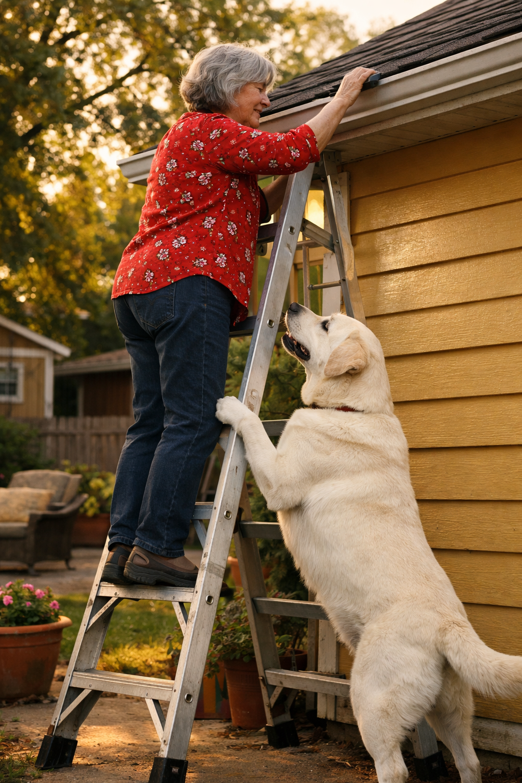 Мой пёс пытался залезть на лестницу следом за мной. Его лапы скользили по металлическим ступеням, когти скребли по металлу, а глаза были широко раскрыты и смотрели прямо на меня.