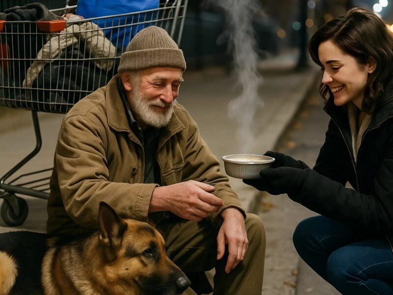 Он несколько раз поблагодарил меня, сказал, что не ел больше суток. Собака легонько завиляла хвостом, будто тоже благодарила. Мужчина ел медленно, аккуратно, словно боялся, что тарелка исчезнет, если моргнёт слишком долго. Он ел с удовольствием, а я смотрела и чувствовала, как у меня на душе становится теплее.