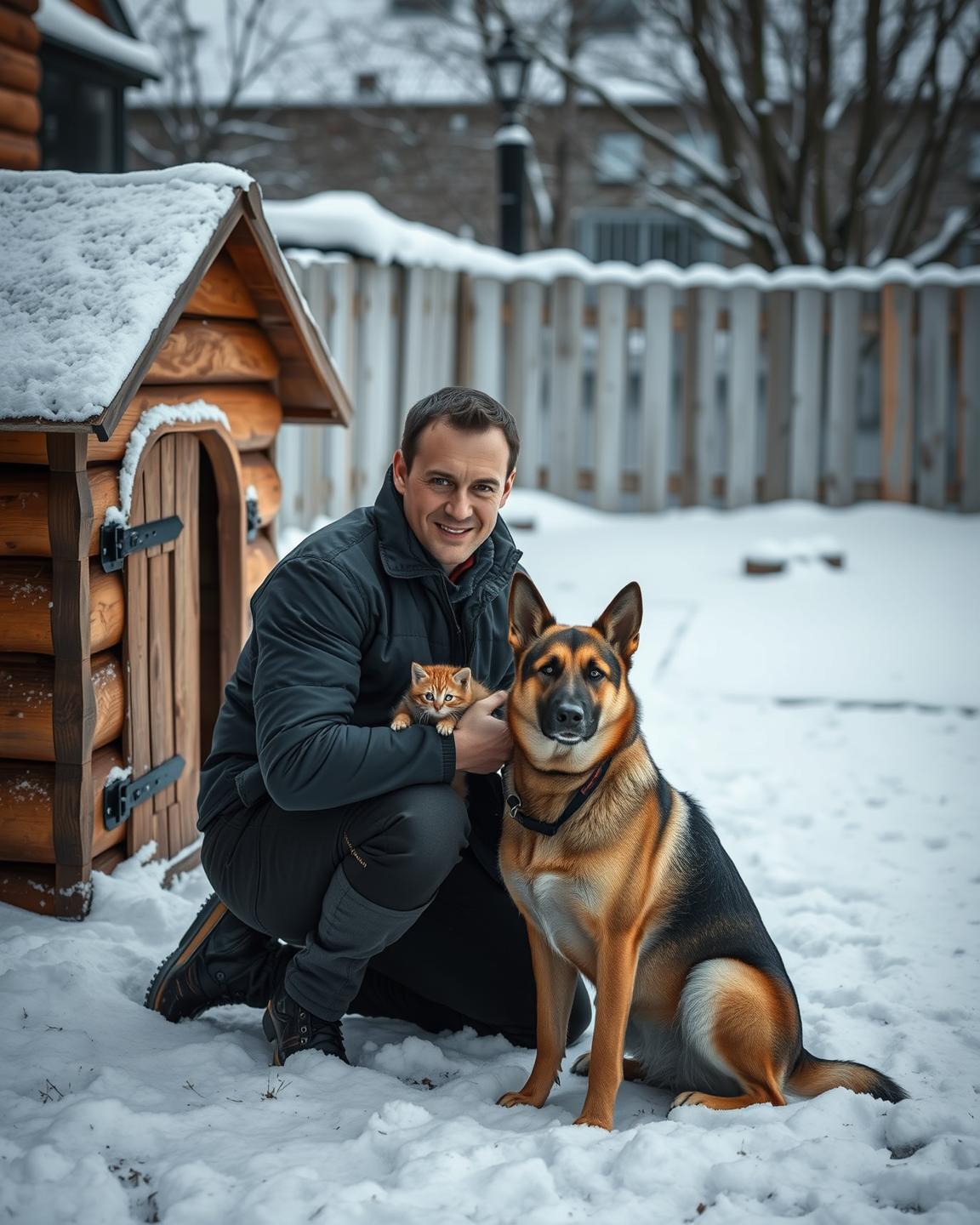 Внутри, свернутый в покрывале, лежал крошечный котёнок грязный, обмороженный, едва дышащий. Его глаза открывались с трудом, а тело дрожало от холода. Барс нашёл его гдето и, вместо того чтобы прогнать или оставить, приютил. Он спал на улице, чтобы не напугать крошку, и охранял вход, будто в будке хранилась драгоценная сокровищница.
